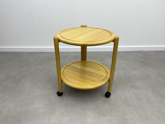 Rare desserte ronde danoise des années 1970, avec plateau tournant. Conçue par Jens Quistgaard et fabriquée au Danemark, cette élégante desserte est réalisée avec soin en bois de bouleau massif et peut servir de desserte, de desserte de bar ou de table d'appoint.