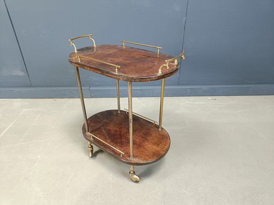 Chariot de bar italien en peau de chèvre laquée et parchemin par Aldo Tura, années 1960