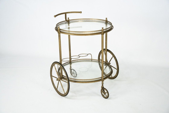 Ce chariot de bar ou de service en laiton, conçu par Cesare Lacca et produit en Italie dans les années 1950, est en très bon état vintage et présente des signes typiques d'âge et d'utilisation, conformes à son époque.