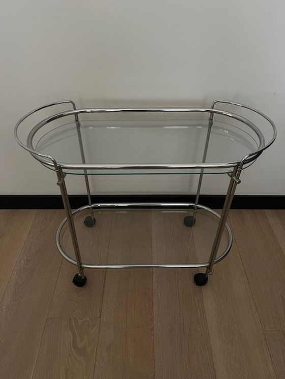 Un magnifique chariot de Galotti et Radice. Ce modèle très reconnaissable est fabriqué en métal tubulaire magnifiquement chromé. La forme ronde de la structure lui confère un style moderne. Il contient 2 plateaux en verre et est équipé de 4 roues noires qui le rendent facile à déplacer. Il est en très bon état et est destiné aux vrais amateurs de design.