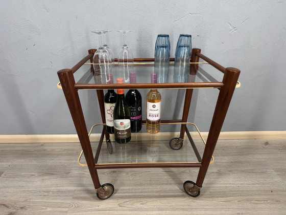 Mots-clés : Cees Braakman, chariot de service, chariot vintage, design néerlandais, structure en teck, étagères en verre, milieu du siècle, détails en laiton, classique du design