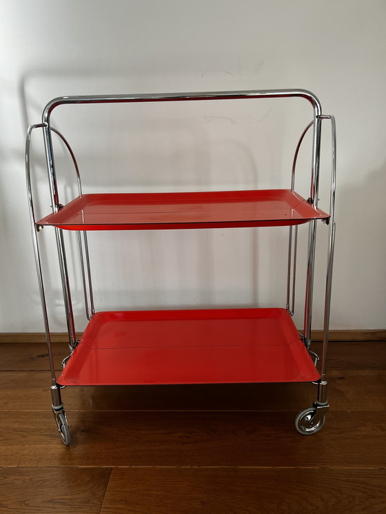 Ce chariot de service vintage en rouge/orange foncé a été fabriqué dans les années 1960 par Bremshey à Sollingen, en Allemagne. Caractéristiques : très bonne qualité de fabrication, matériaux de haute qualité. Il est pliable et très pratique à ranger. Une fois pliée, la desserte ne mesure que 7 à 8 cm de large. Le chariot de service est doté d'un cadre en fil d'acier chromé et de deux niveaux. Les plateaux sont en Gerlinol rouge et sont faciles à nettoyer. Le système de pliage de ce chariot fonctionne avec des ressorts. Les roulettes chromées sont équipées de pneus en caoutchouc et se déplacent en douceur. Ce chariot de service Bremshey est mentionné par le célèbre antiquaire britannique Michael Hogben dans son livre '100 Antiques of the Future'.