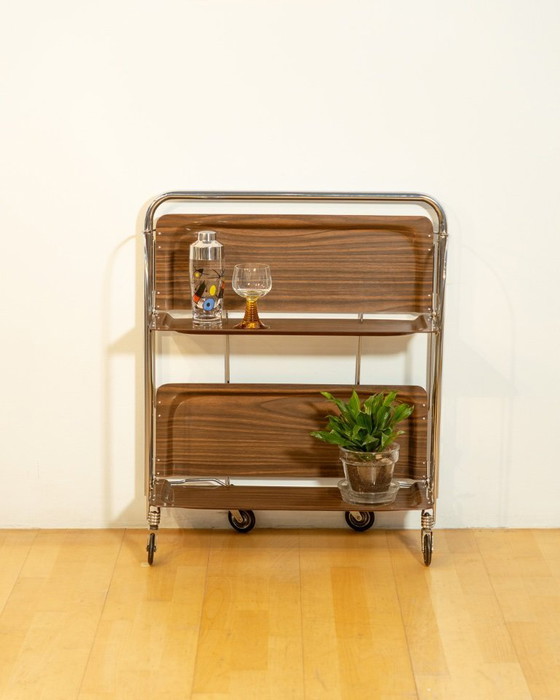Un chariot vintage fonctionnel et élégant signé Raquer. La structure chromée associée aux étagères en placage bois foncé crée un style classique du milieu du XXe siècle. Son format pliable facilite le rangement tout en offrant une grande polyvalence : chariot de service, table d'appoint ou desserte. Un meuble pratique et stylé qui apportera du caractère à votre intérieur.