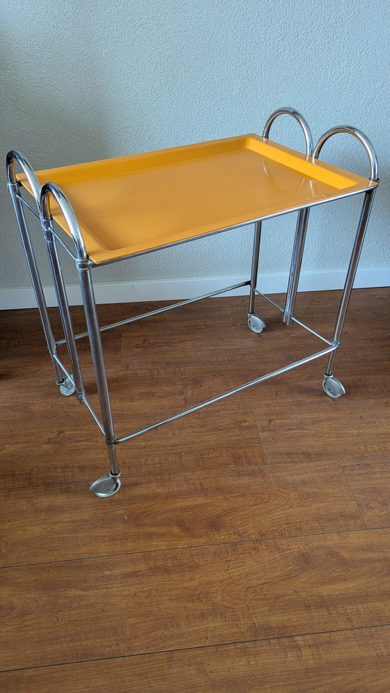 Équipée de roulettes et entièrement pliable. Un bel objet qui attire l'attention et qui est très pratique à utiliser tout en ayant un beau design. Cadre chromé avec dessus en plastique. Il présente de légères traces d'utilisation mais est en bon état pour son âge. Peut encore être utilisé pendant des années.