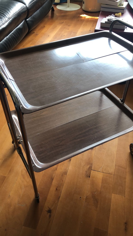 Plongez dans un univers d'élégance intemporelle avec ce chariot de bar vintage à roulettes. Idéal pour les amateurs de charme rétro, ce meuble allie avec brio fonctionnalité et style, et trouvera parfaitement sa place dans tout intérieur raffiné.