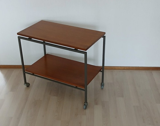Ce chariot à thé minimaliste se compose d'une structure en acier et de deux étagères en teck.