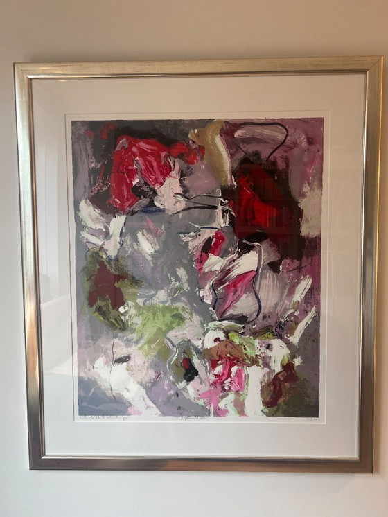 Grande sérigraphie abstraite de Charlotte Molenkamp, intitulée « Jardin japonais », représentant des fleurs et des jardins. Ses formes dynamiques et ses couleurs vibrantes, un mélange harmonieux de rouge, rose, vert et gris, en font une pièce maîtresse qui s'intégrera parfaitement à tout intérieur.