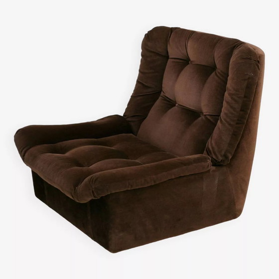 Steiner. Chauffeuse en velours, circa 1970. Une petite décoloration sur l'assise, un bouton de couleur plus claire. Très confortable. Design space age.