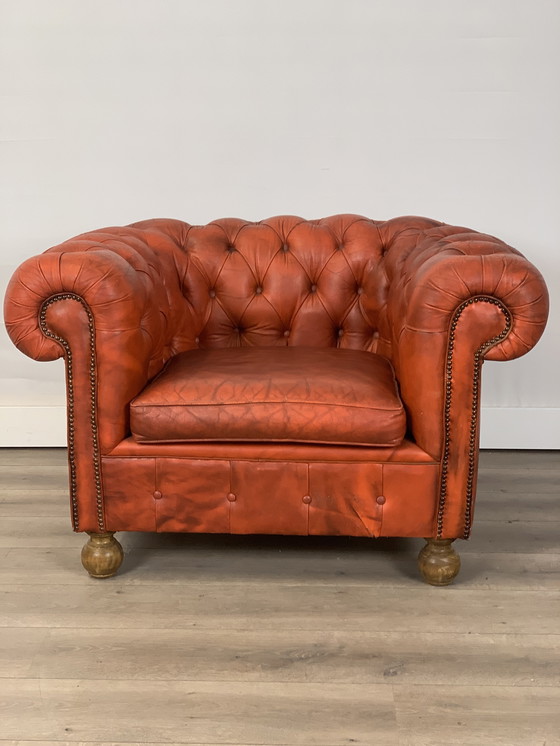 Entrez dans un monde d'élégance classique avec ce fauteuil Chesterfield, une pièce intemporelle qui respire la sophistication et le charme. Son revêtement en cuir orange riche, orné d'un profond capitonnage, vous invite à vous enfoncer dans son confort moelleux tout en ajoutant une touche vibrante à n'importe quelle pièce.