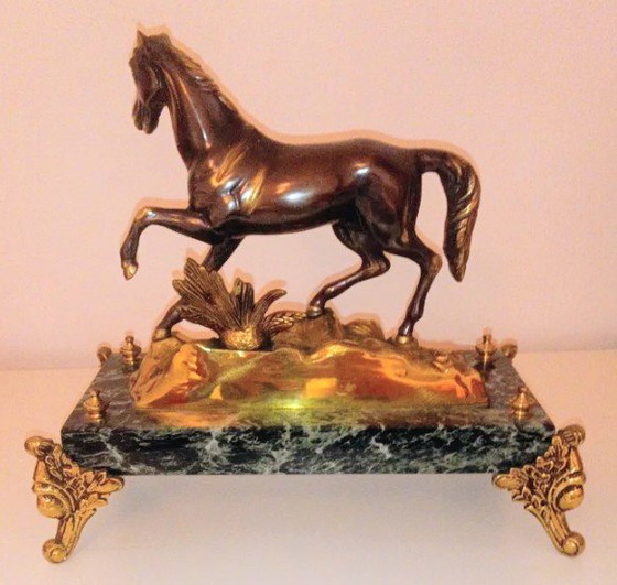 Magnifique cheval ancien en bronze, partiellement doré, sur un socle en marbre, en très bon état.