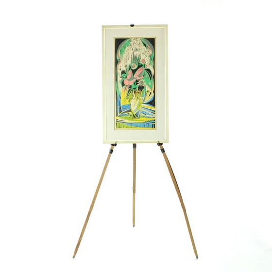 Grand chevalet en bois de chêne et pièces métalliques. Fabriqué en Tchécoslovaquie dans les années 1930 et utilisé intensivement par un photographe en Slovaquie jusqu'en 2000. Le chevalet est entièrement fonctionnel, chaque pied étant réglable par un système de vis. Il comporte une partie supérieure en métal qui peut accueillir un tableau ou un cadre. En très bon état avec une légère usure.