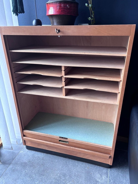 Classeur vintage à portes coulissantes, fabriqué par Ekawerk Lippe. Design minimaliste en placage de bouleau aux angles arrondis. Convient à de nombreux styles d'intérieur. Magnifique meuble de rangement allemand de style Bauhaus Art déco. Voir les photos pour plus de détails et les signes d'usure. Tous les tiroirs et clés sont d'origine. Dimensions : H 104 cm, L 80 cm, P 35 cm.