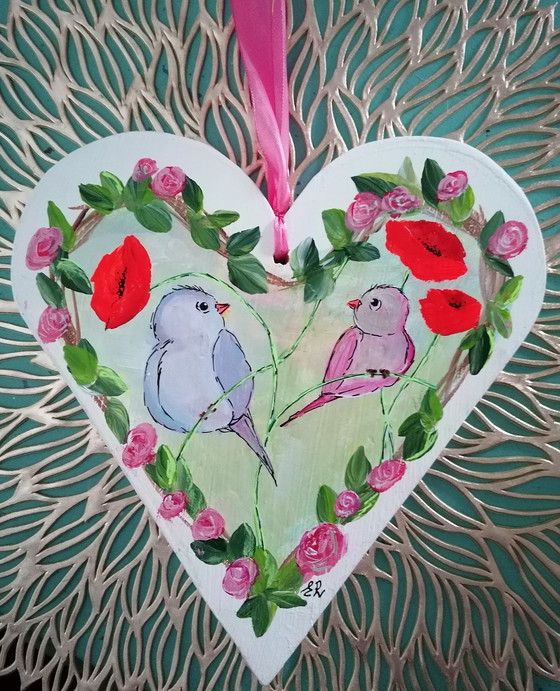 Grand cœur en bois peint à la main, orné d'un couple d'oiseaux entouré de coquelicots et de plusieurs fleurs. Livré avec un joli ruban. Dimensions : 21 cm x 22 cm. Toutes mes créations sont uniques !