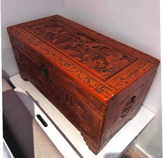 Découvrez la beauté intemporelle de ce coffre à couvertures oriental en teck, un chef-d'œuvre d'artisanat et d'élégance. Avec ses riches tons bruns et ses sculptures raffinées, ce coffre apporte une touche d'exotisme à votre intérieur.