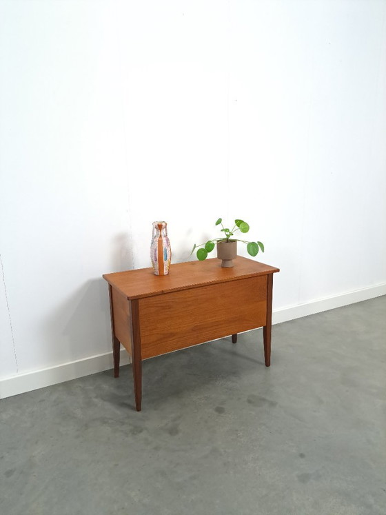Le coffre en teck est en bon état, avec de légères traces d'usage, normales pour un objet vintage.