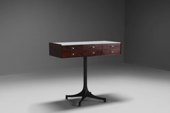 L'un des tiroirs est conçu comme un tiroir à bijoux, avec des séparateurs internes pour ranger les petits objets. La commode offre une série de compartiments aux dimensions bien pensées, inspirés des principes du design japonais qui célèbrent l'ordre, l'équilibre et la beauté des petits objets personnels. Ce meuble est réalisé en palissandre indien au grain riche et en stratifié blanc. Il repose sur un socle en aluminium moulé sous pression peint en noir, orné de ferrures en nickel raffinées. À la fois pratique et sculptural, ce meuble incarne l'esthétique moderne et intemporelle associée à Herman Miller.