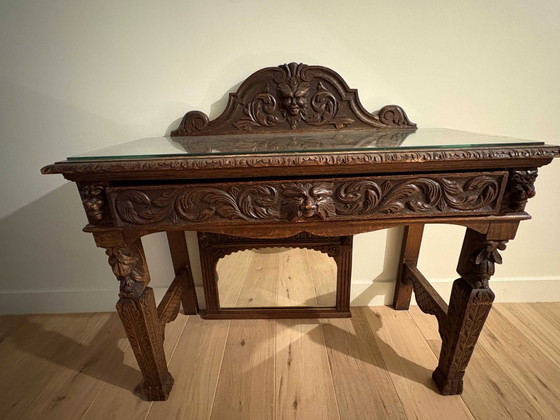 Authentique coiffeuse en bois massif sculpté à la main, ornée d'un lion. La hauteur de la coiffeuse inclut l'ornement. Un miroir assorti complète l'ensemble.