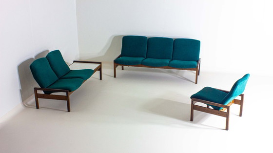 Habillé d'un luxueux tissu vert pétrole, cet ensemble unique signé Georges van Rijk pour Beaufort dégage une allure à la fois décontractée et affirmée, empreinte de modernité et de fraîcheur. Sa teinte verte vibrante évoque les palettes de couleurs audacieuses de son époque, tout en possédant une intemporalité qui s'accorde parfaitement avec les tendances actuelles en matière de décoration intérieure. Fabriqué en bois de wengé africain, l'ensemble se compose de deux bases 3 places et d'une base 1 place. Entièrement modulables, les assises et le plateau de la table permettent de créer de multiples configurations.