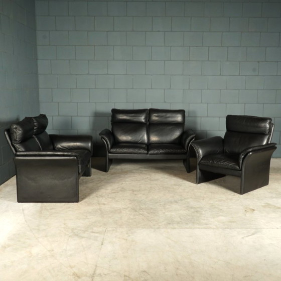 Le fabricant de meubles allemand Dreipunkt est synonyme d'élégance intemporelle, de qualité supérieure et d'un design incomparable. Portant une attention particulière à la perfection de son savoir-faire, Dreipunkt crée des meubles non seulement fonctionnels, mais aussi esthétiques. La série exclusive SCALA, un produit phare de sa gamme, séduit par son design épuré et son souci du confort d'assise. L'ensemble se compose de deux canapés deux places et d'un fauteuil recouverts de cuir noir. L'ensemble est en excellent état et présente très peu de traces d'usure. L'étiquette de la marque est incluse.
