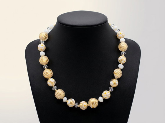 Ce collier est composé de perles de verre de Murano façonnées à la main et rehaussées de feuilles d'or 24 carats fusionnées au verre lors de sa fabrication. Certaines perles présentent des décors floraux réalisés selon la technique de la murrina, un élément distinctif du savoir-faire verrier de Murano, visible dans les motifs floraux incrustés dans le verre.