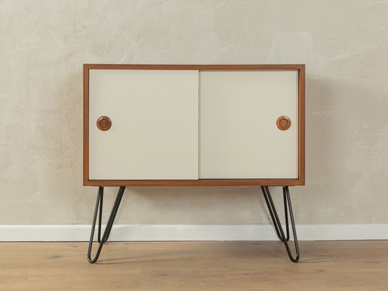 Magnifique commode des années 1950. Corpus en placage de noyer avec deux portes coulissantes revêtues de Resopal en blanc crème, une étagère et des pieds en épingle à cheveux typiques en noir. Fabriquée en Allemagne.