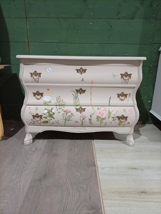 Cette charmante commode allie l'élégance vintage à un imprimé floral ludique. Fabriquée en bois et finie dans une douce teinte crème (Taupe Cathédrale FMP), elle est ornée de motifs floraux colorés. Parfaite pour ajouter une touche de romantisme à n'importe quelle pièce. Idéale dans la chambre ou comme pièce maîtresse dans le salon.