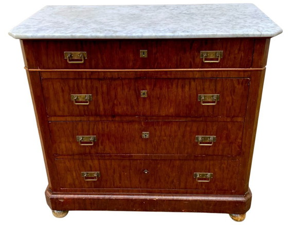Découvrez cette élégante commode à 4 tiroirs, inspirée du style bateau marine militaire vintage. Sa structure en bois massif est surmontée d'un magnifique plateau en marbre blanc, ajoutant une touche de sophistication à son allure robuste. Les poignées et les ferrures en métal accentuent son charme d'époque tout en assurant une fonctionnalité optimale.