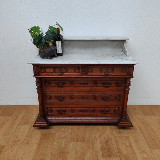 Commode rustique de style ancien avec plateau en marbre blanc. Commode vintage classique dotée de deux petits tiroirs et de trois grands tiroirs. Cette commode offre un espace de rangement généreux. Son style classique est accentué par les élégantes sculptures ornant les tiroirs. Sa hauteur de 84,5 cm offre une hauteur de travail confortable et la rend idéale comme meuble de salle de bain.