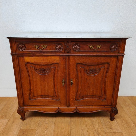 Commode rustique de style ancien avec un plateau en marbre blanc. Commode vintage classique dotée de deux petits tiroirs et de deux portes avec serrures fonctionnelles. Derrière les portes se trouve une étagère. Cette commode offre un grand espace de rangement. Son style classique est sublimé par le plateau en pierre naturelle. Sa hauteur de 89 cm offre une hauteur de travail confortable et la rend idéale comme meuble de salle de bain.