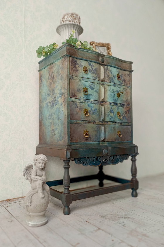 Je propose un magnifique meuble ancien en bois, repensé dans un style français avec des tons bleus et turquoise. La finition est réalisée avec des peintures à la craie écologiques, sans solvants. Une cire protectrice permet de nettoyer facilement la peinture sans l'abîmer.