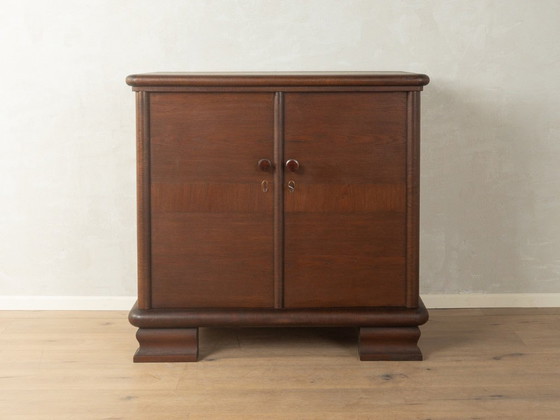 Commode Art déco des années 1930. Structure de haute qualité en placage chêne teinté foncé, deux portes, une étagère et pieds décoratifs.