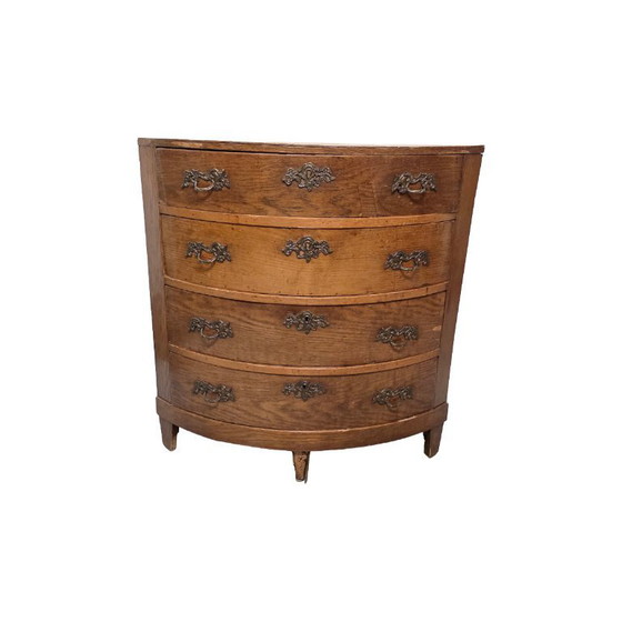 Commode d'angle hollandaise ancienne, début du XIXe siècle. Cette charmante commode d'angle présente un style Louis XVI. Elle est en pin et chêne plaqué chêne, avec des poignées en laiton. On note quelques anciennes réparations et des dommages au placage sur les bords (voir photo). Le plateau a été remplacé et il manque des plaques de chêne sur le pied avant.