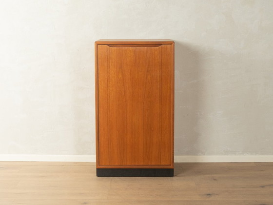 Commode classique des années 1960. Structure de haute qualité en placage teck, une porte, deux étagères et un piètement noir.
