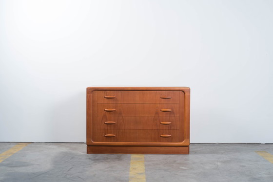 Rare commode produite par Dyrlund au Danemark dans les années 1960. Il s'agit d'un meuble en teck de grande qualité avec 4 grands tiroirs. Un meuble plutôt simple, mais fabriqué avec un grand souci du détail, comme en témoignent les bords arrondis et les poignées soigneusement finies. En excellent état. Dimensions (l x p x h) : 120 × 78,5 × 52 Disponible à Herentals, Belgique. Livraison possible en consultation.
