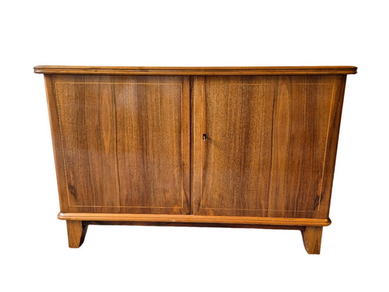 Commode en bois de chêne massif à deux portes, de style Mid Century, originaire du Luxembourg. Il y a un léger dommage sur la surface supérieure. Possibilité de rénovation légère - nouvelles poignées, allègement des portes, suppression des bordures et changement des pieds.