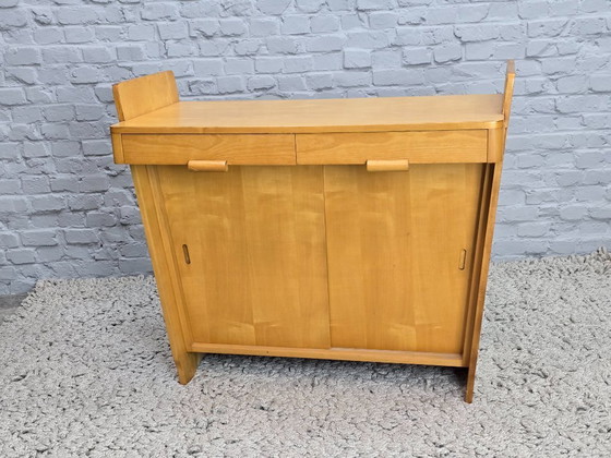 Commode raffinée en frêne, typique du milieu du XXe siècle, conçue dans l'esprit du mobilier moderniste néerlandais des débuts. Ses formes et ses détails rappellent les premières créations Pastoe des années 1950. Ce meuble comprend deux tiroirs peu profonds surmontant un compartiment de rangement fermé par deux portes coulissantes. Les poignées cylindriques en bois, discrètement fixées sous les façades des tiroirs, évoquent subtilement l'Art déco tardif, caractéristique de la période de transition entre le modernisme d'avant-guerre et le fonctionnalisme d'après-guerre. Les panneaux latéraux surélevés forment un plateau pratique, soulignant sa vocation de commode ou de table à langer. Réalisée en frêne clair au grain expressif, cette pièce aux proportions harmonieuses, élégante et sobre, est en très bon état vintage, ne présentant que de légères traces d'usure liées à son âge. Un exemple discret et sophistiqué du design nord-européen du milieu du XXe siècle. Dimensions : Hauteur 89 cm, Largeur 100 cm, Profondeur 49 cm.