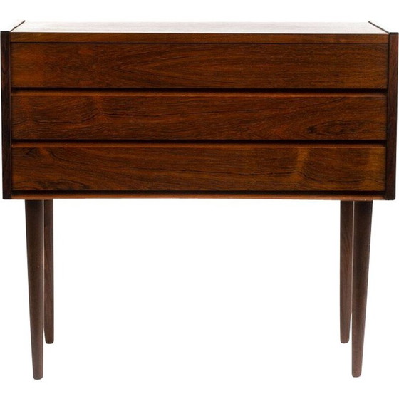 Élégante commode danoise vintage de petite taille avec trois tiroirs sur des pieds hauts, qui est faite de bois de rose avec de beaux motifs de grain dans le placage. Ce meuble se distingue par son design épuré. Le meuble est de haute qualité, comme en témoignent les assemblages à queue d'aronde.