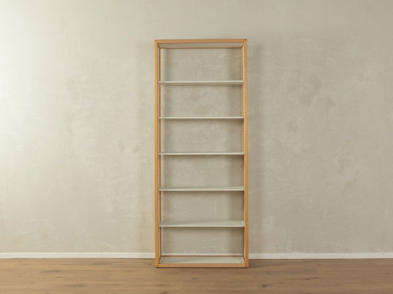 Commode sur pied de la collection Flötotto Profilsystem des années 1970. Cadre de haute qualité en hêtre massif, cinq étagères et revêtement Formica original en gris clair.