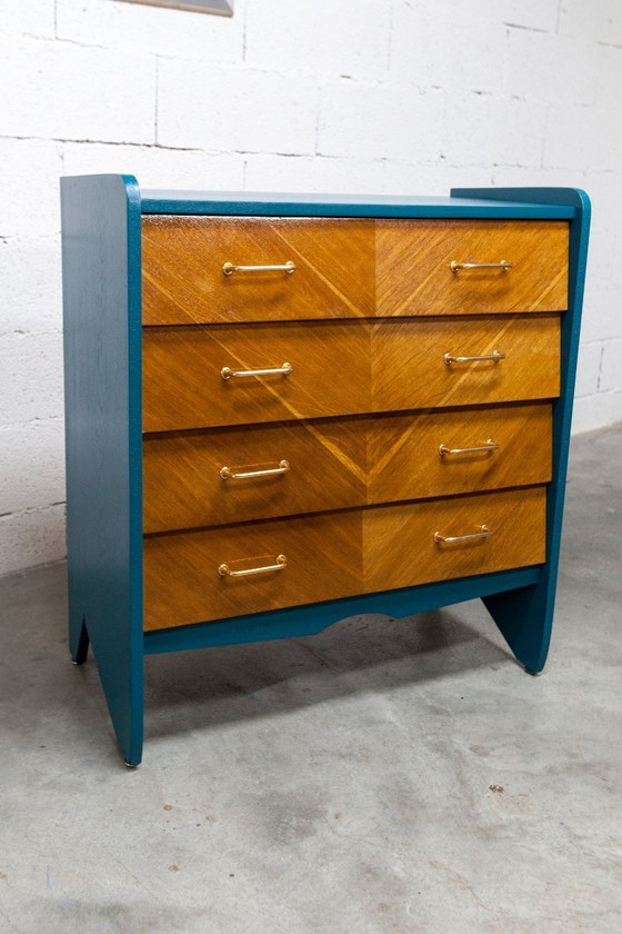 Elle a été repeinte en bleu Ainhoa Satiné et les tiroirs ont été vernis avec la couleur chêne doré brillant.