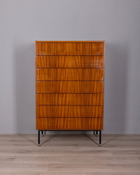 Commode sept tiroirs en teck, pieds en métal noir et laiton doré, design italien, années 1960.
