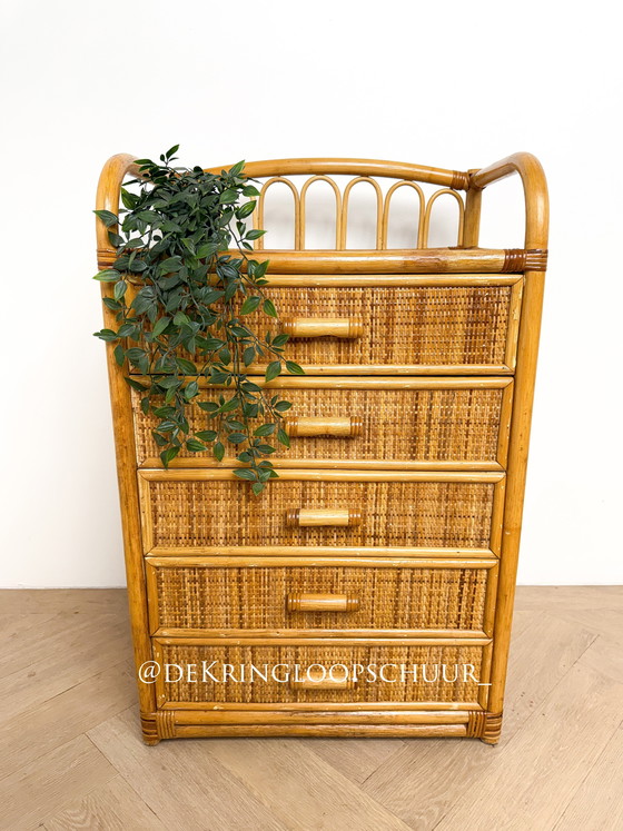 À VENDRE : Commode en rotin, incroyablement pratique pour ranger ses affaires. Idéale aussi pour une chambre d'enfant. Cette commode possède cinq tiroirs et est en très bon état. 💚