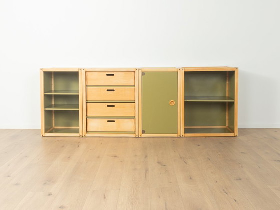 Système Profilsystem quatre éléments de Flötotto, datant des années 1970. Il se compose d'un caisson à tiroirs, d'un caisson avec porte et étagères, et de deux caissons ouverts avec étagères. Les structures sont en hêtre massif. Revêtement HPL vert d'origine.