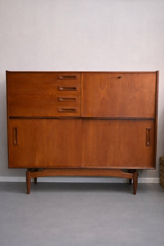 Buffet haut unique, conçu par Louis Van Teeffelen aux Pays-Bas dans les années 1960. Ce buffet est en teck et placage de teck. Ce magnifique meuble est en bon état vintage et comprend quatre tiroirs aux poignées finement travaillées, deux portes coulissantes et un plateau à charnières (avec clé) sur la droite.