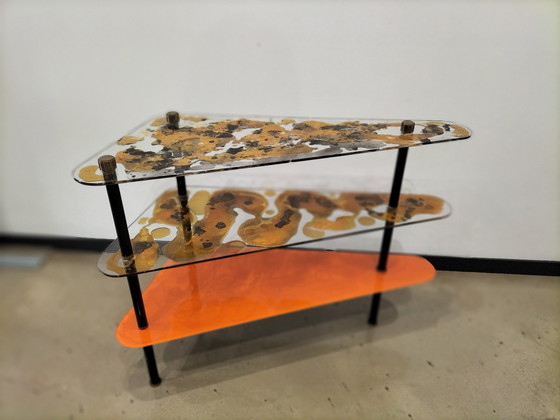 - Dotée de trois plateaux en verre, dont deux sont signés par l'artiste Yann Bruckner, cette console se distingue par l'application de résine et de pigments sous les plateaux, créant un effet visuel captivant.