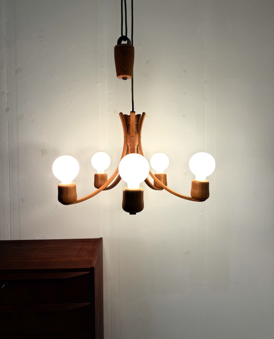 Le lustre possède cinq bras incurvés en teck et une douille standard E27. En excellent état, il ne manquera pas d'attirer les regards.