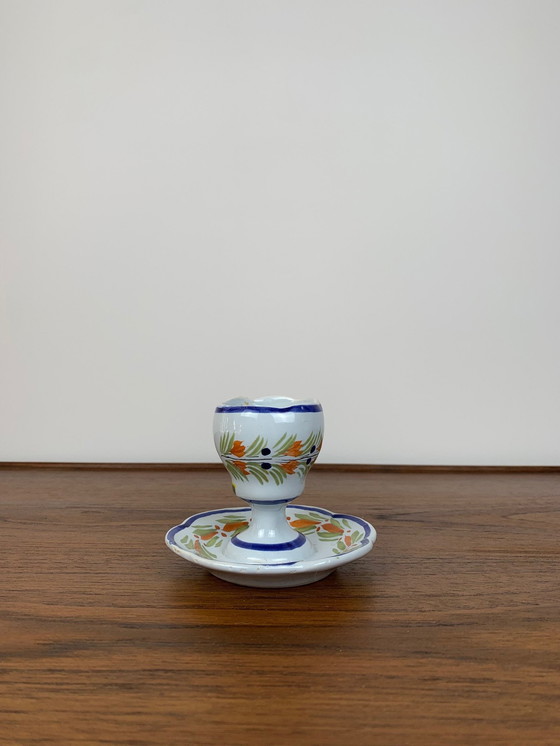 Coquetier Henriot, Quimper France, peint à la main, avec soucoupes attachées
