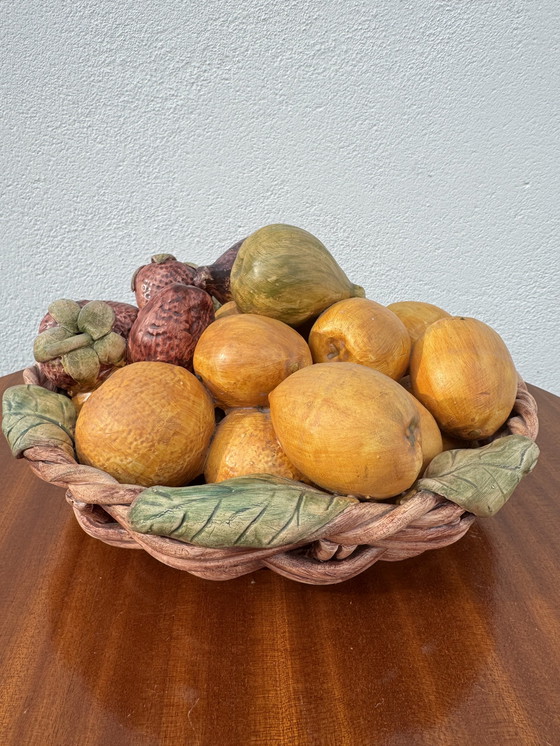 Superbe corbeille de fruits (mandarines, figues, fraises, citrons) en céramique trompe l’œil par Leonor Santos (JMF, Alcobaça, Portugal) des années 70; globalement en très bon état (à noter une queue de fraise qui semble manquer et une éclat sur une feuille: voir photos)