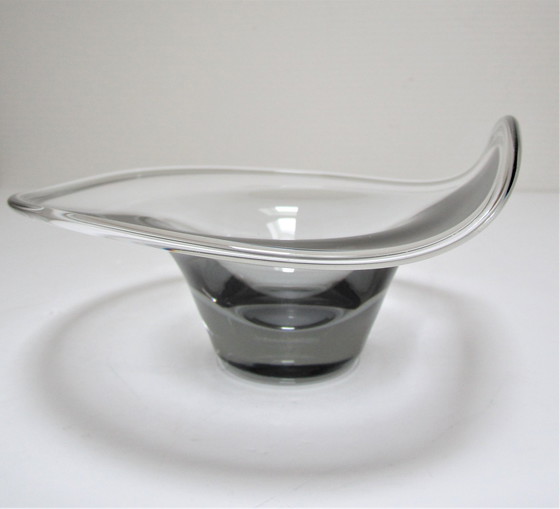 coupelle en verre par vicke lindstrand pour kosta. travail des années 70. coupelle à large aile en verre légèrement fumé. estampillée lindstrand-kosta à l’acide sous la base et gravée à la pointe lh 1027. longueur totale 18 cm. hauteur totale 8, 5 cm. très bel état d’ensemble. noter de très rares et très discrètes rayures d’usage courantes sous la base et une infime égrenure sur un bord (voir photos et zoomer).