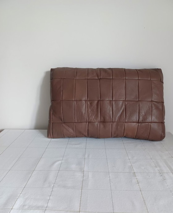 Coussin patchwork vintage (années 1970-1985) en cuir souple et lisse, dans un brun clair chaleureux.