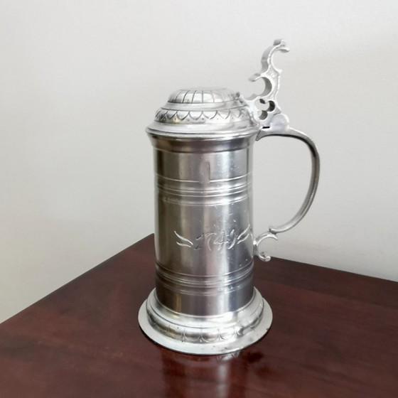Chopine à bière ancienne en étain, datant de 1749. Elle ne porte aucune marque de fabricant, seulement un poinçon à la base indiquant la teneur en étain de l'alliage (95 %). La figure d'un ange brandissant une épée atteste de l'absence de plomb et de la pureté de l'étain. Elle est en excellent état, tant à l'intérieur qu'à l'extérieur. L'étain présente quelques irrégularités dues à l'âge et à l'usage. Dimensions : 23 cm de hauteur, 13 cm de largeur et 9 cm de diamètre à l'ouverture. Pièce de collection.